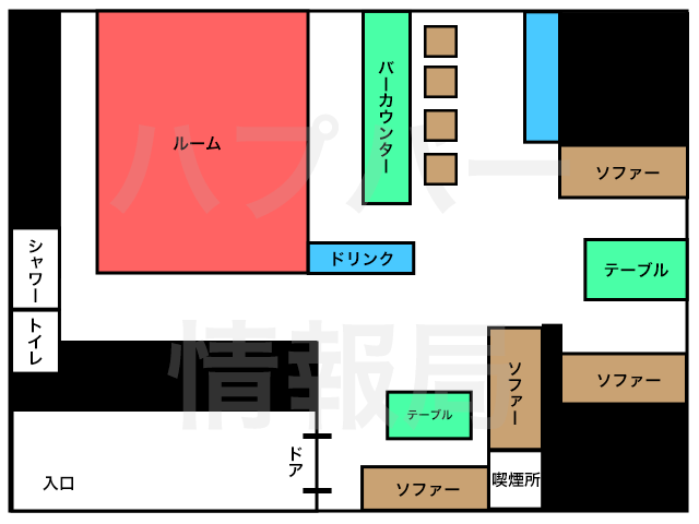 COCOROの店内は、上記のような配置になっており、入り口からドアを1つ挟んでメインフロアに入る流れです。